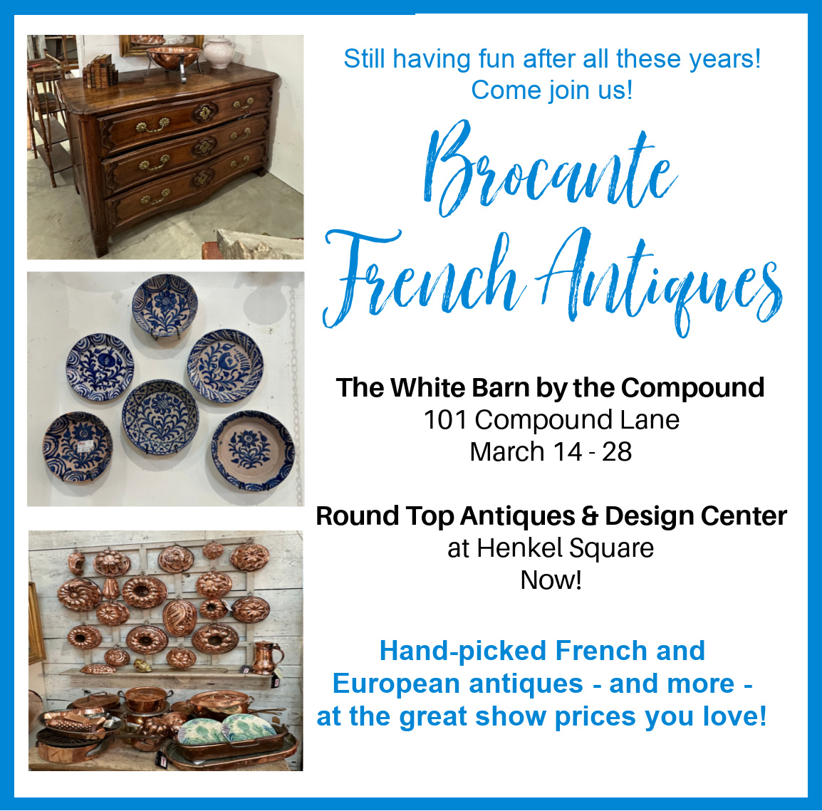 Also selling in premier antiques venues including Round Top and the Antiques and Garden Show of Nashville.